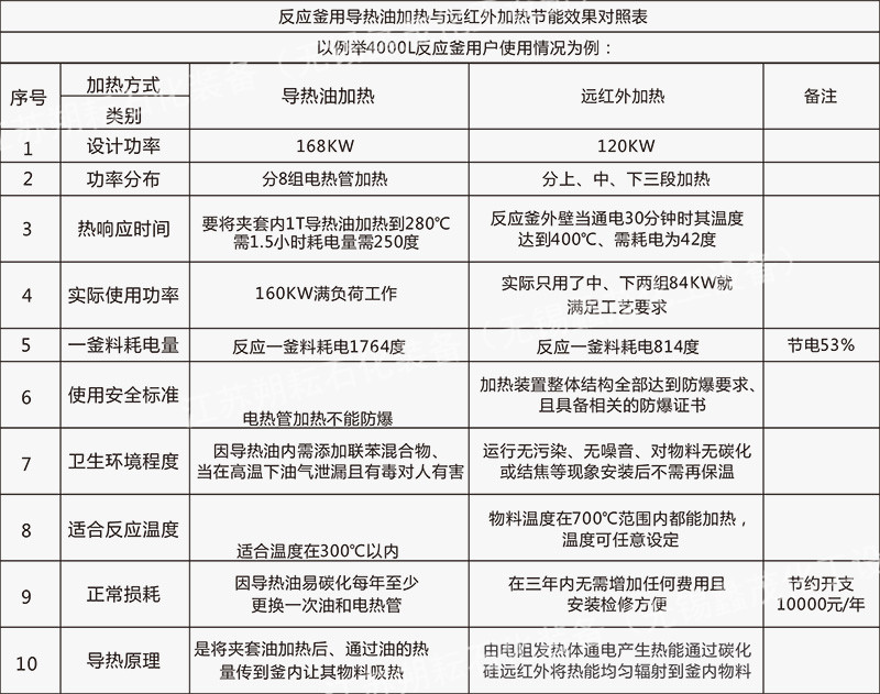 遠(yuǎn)紅外電加熱裝置具有加熱面積大,升溫平穩(wěn)而快,放熱均勻,溫度控制方便,可上、中、下分段控制,釜內(nèi)釜壁溫度易控制,運(yùn)行無(wú)噪音,無(wú)污染,使用壽命長(zhǎng),節(jié)能好。加熱器溫度可在常溫到800℃范圍內(nèi)設(shè)定。為滿足用戶需求,將加熱設(shè)備又進(jìn)行改造,使加熱裝置整體達(dá)到防爆要求,從而解決了用戶一直擔(dān)心且其它加熱方法不能解決的防爆難題。